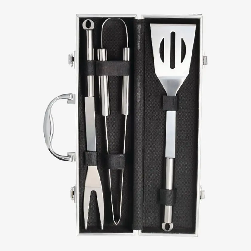 Didn’t think we forgot about grilling the food, did you? This three-piece set includes steel tongs, a fork, and a spatula, all stored in a sturdy metal case.